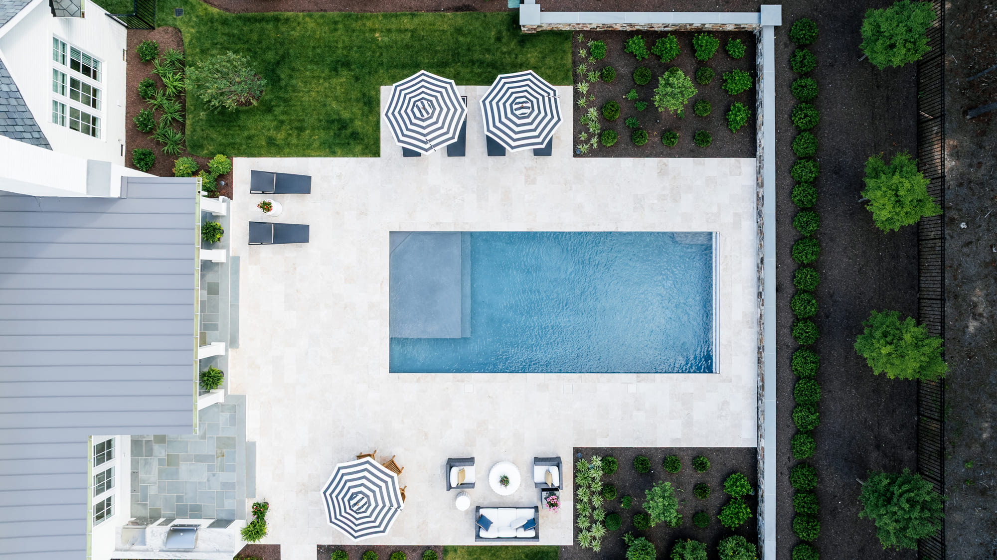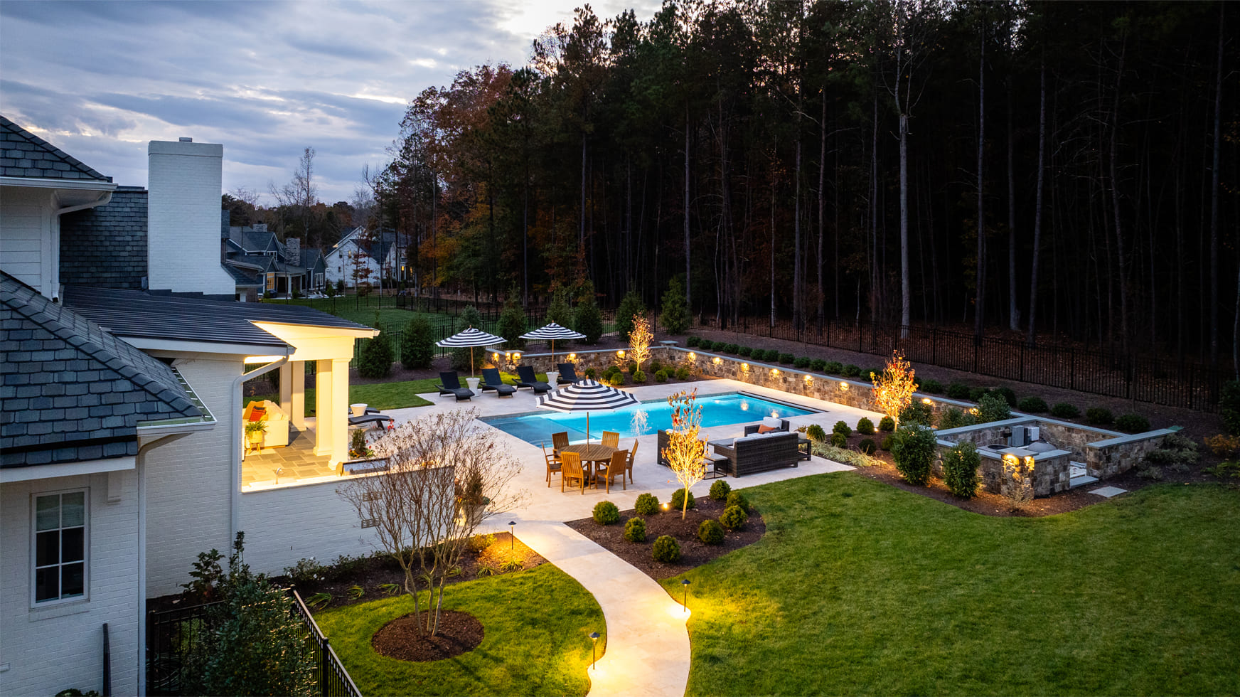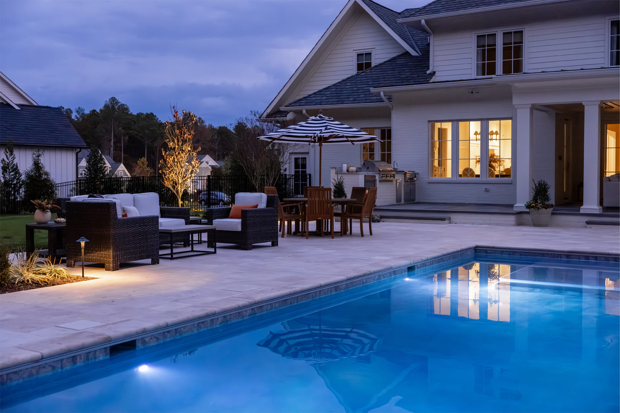 Starting with a new-build blank slate, we designed a fully custom landscape that seamlessly ties into the home’s architecture and enhances everyday outdoor living. The centerpiece of the project is the pool, surrounded by an elegant Ivory Travertine pool deck that provides both durability and timeless style. Layered plantings and a tailored landscape plan bring depth and vibrancy, while custom lighting adds warmth, safety, and nighttime ambiance throughout the space. The result is a cohesive, resort-inspired backyard designed for relaxation, entertaining, and long-term enjoyment.