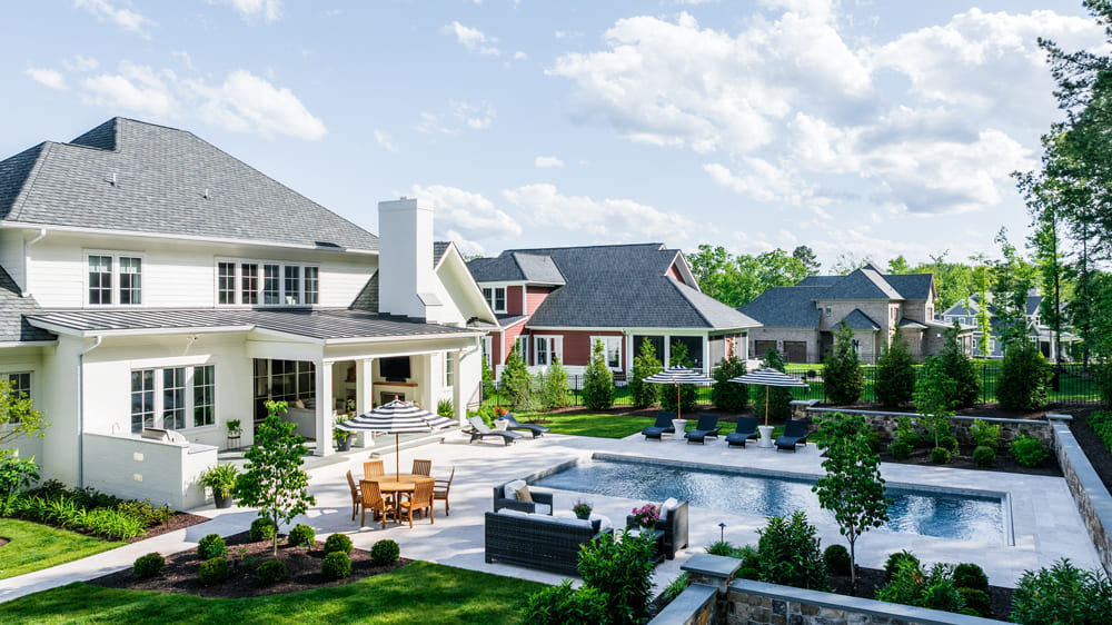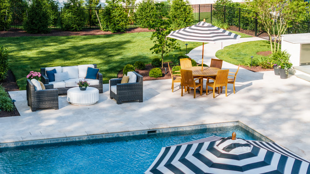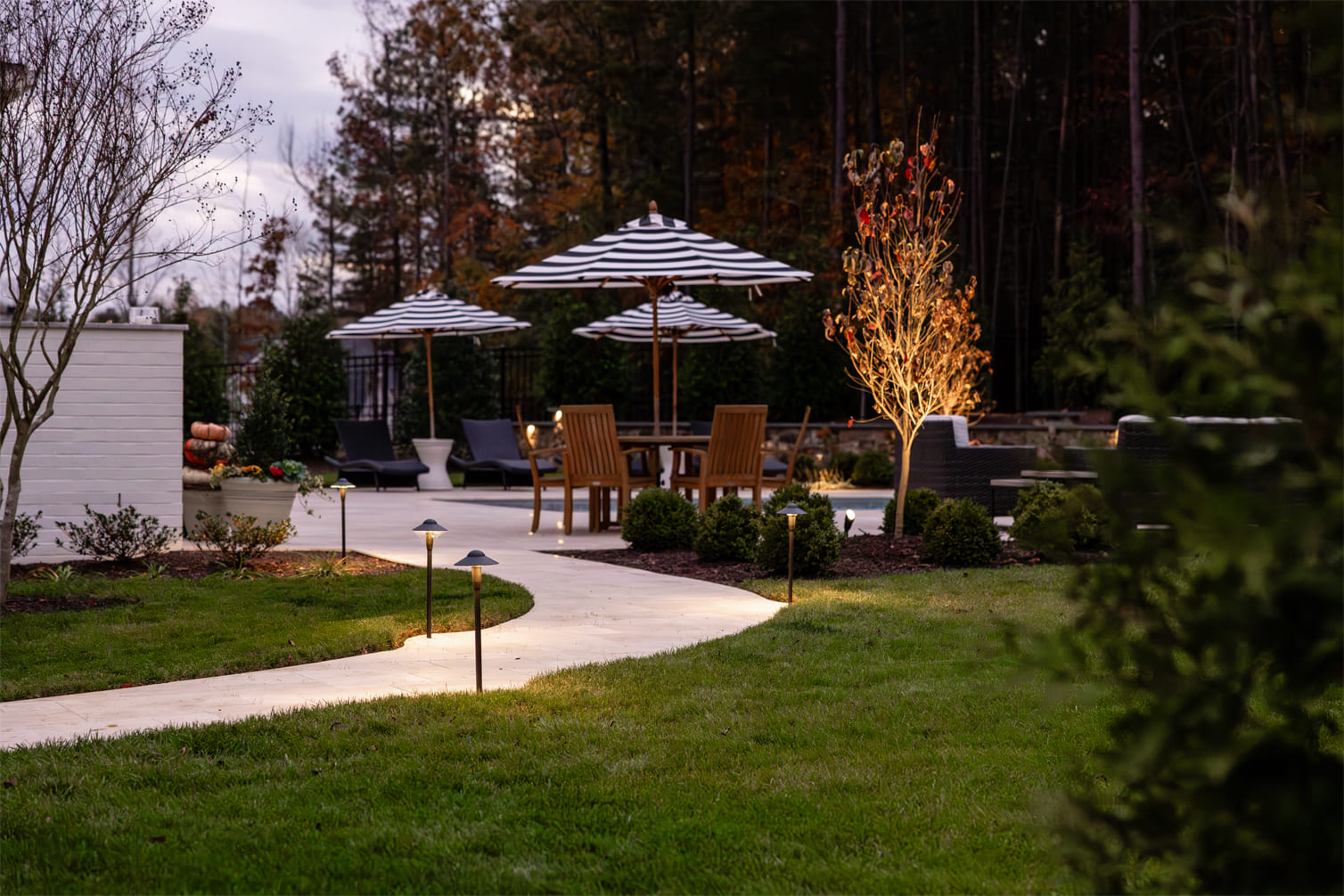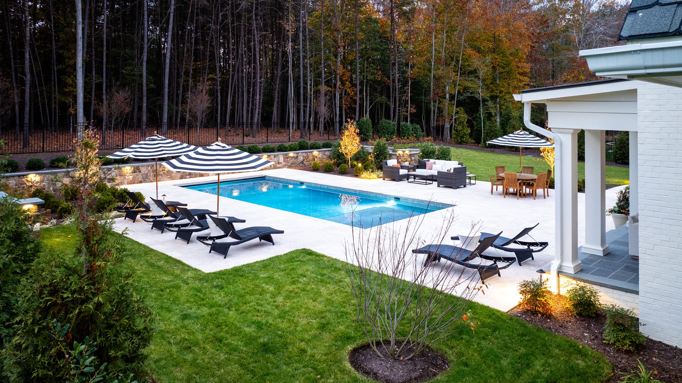 Starting with a new-build blank slate, we designed a fully custom landscape that seamlessly ties into the home’s architecture and enhances everyday outdoor living. The centerpiece of the project is the pool, surrounded by an elegant Ivory Travertine pool deck that provides both durability and timeless style. Layered plantings and a tailored landscape plan bring depth and vibrancy, while custom lighting adds warmth, safety, and nighttime ambiance throughout the space. The result is a cohesive, resort-inspired backyard designed for relaxation, entertaining, and long-term enjoyment.