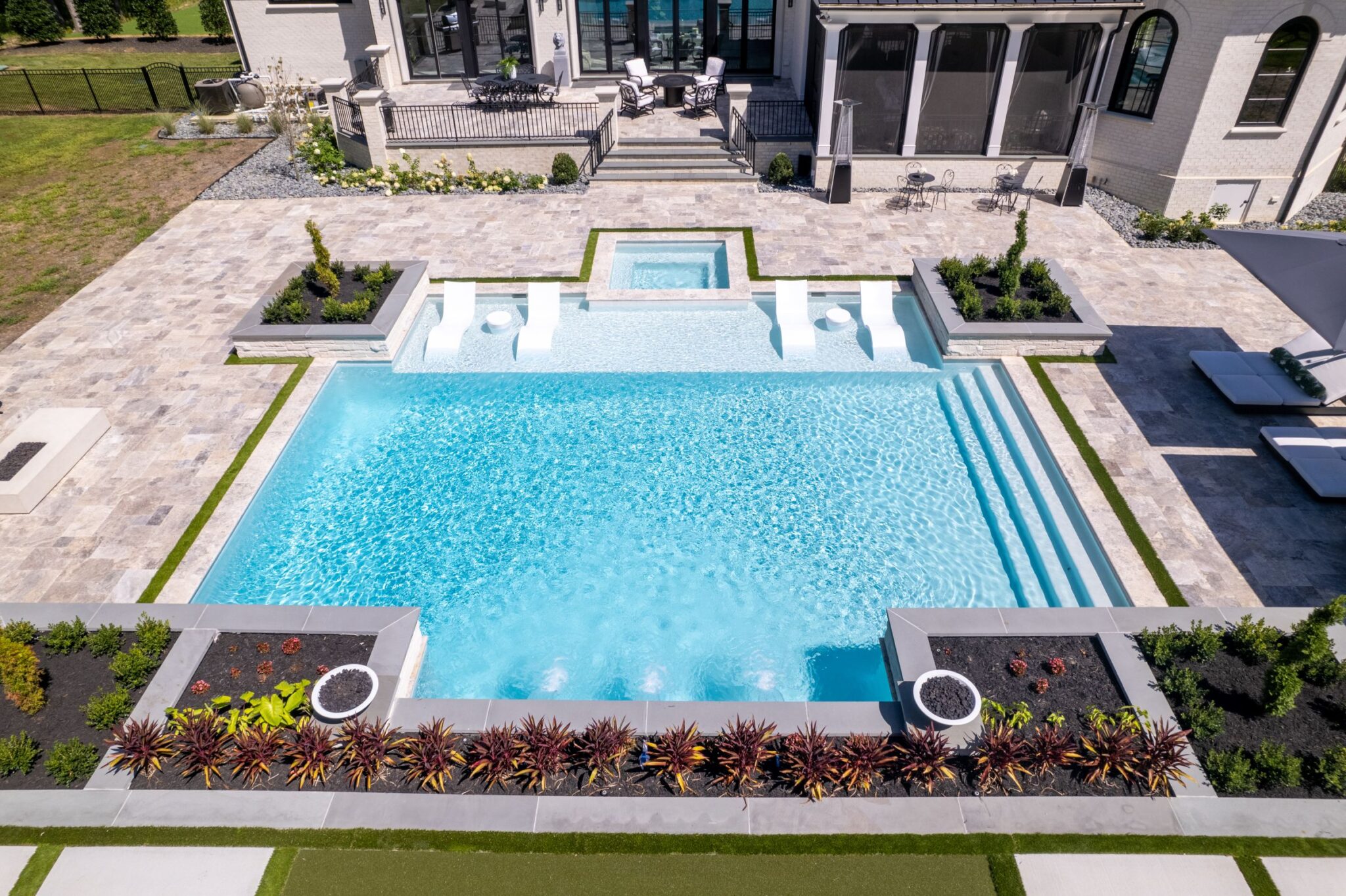 Artificial turf is another trend that has gained traction. Whether used for putting greens or as simple 8-inch accents around the pool area, artificial turf offers a low-maintenance, evergreen option that adds a touch of greenery without the upkeep of natural grass. It can create a visually appealing contrast with the hardscape materials and provide a soft surface for walking or lounging. Careful though, this material can also be extremely hot and is not recommended for larger surface areas around a pool where people will gather.